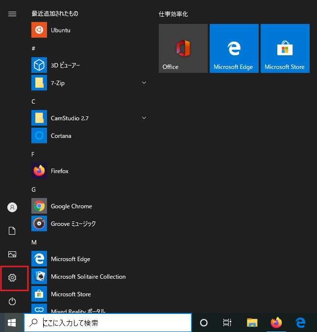 もう一つの方法は、デスクトップ左下にあるスタートボタンを左クリック、設定(歯車の形のアイコン)を左クリックします。